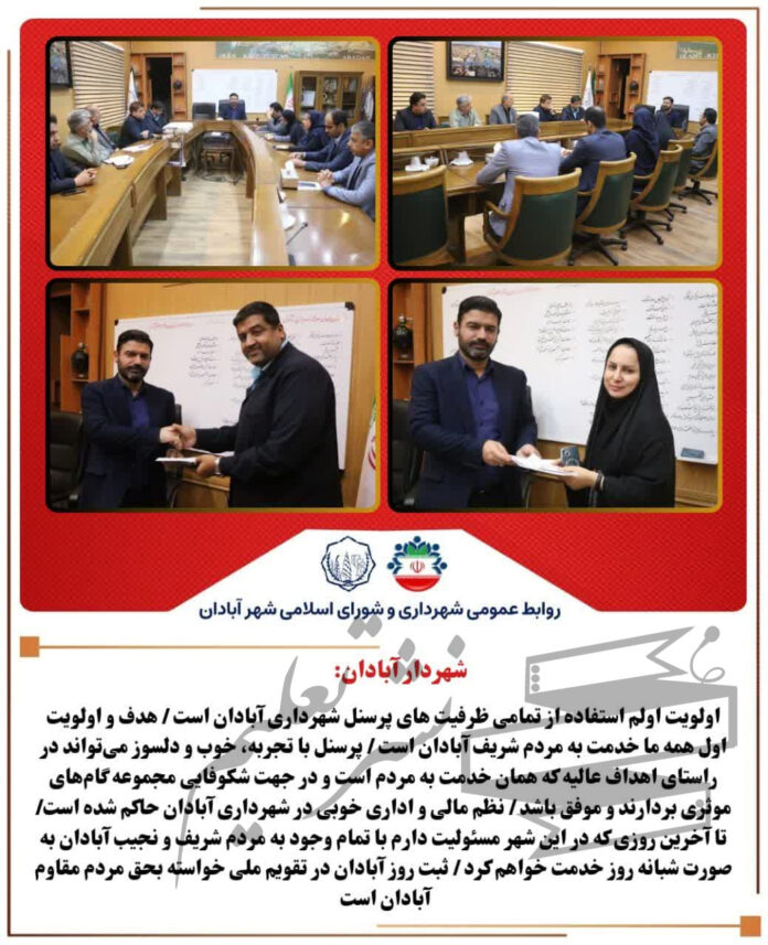 اولویت اولم استفاده از تمامی ظرفیت های پرسنل شهرداری آبادان است / هدف و اولویت اول همه ما خدمت به مردم شریف آبادان است / پرسنل با تجربه، خوب و دلسوز میتواند در راستای اهداف عالیه که همان خدمت به مردم است و در جهت شکوفایی مجموعه گامهای موثری بردارند و موفق باشد / نظم مالی و اداری خوبی در شهرداری آبادان حاکم شده است/ تا آخرین روزی که در این شهر مسئولیت دارم با تمام وجود به مردم شریف و نجیب آبادان به صورت شبانه روز خدمت خواهم کرد / ثبت روز آبادان در تقویم ملی خواسته بحق مردم مقاوم آبادان است